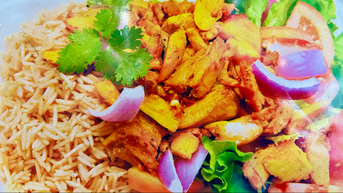 A combination of grilled chicken, beef, and lamb served over rice with salad and house sauces.